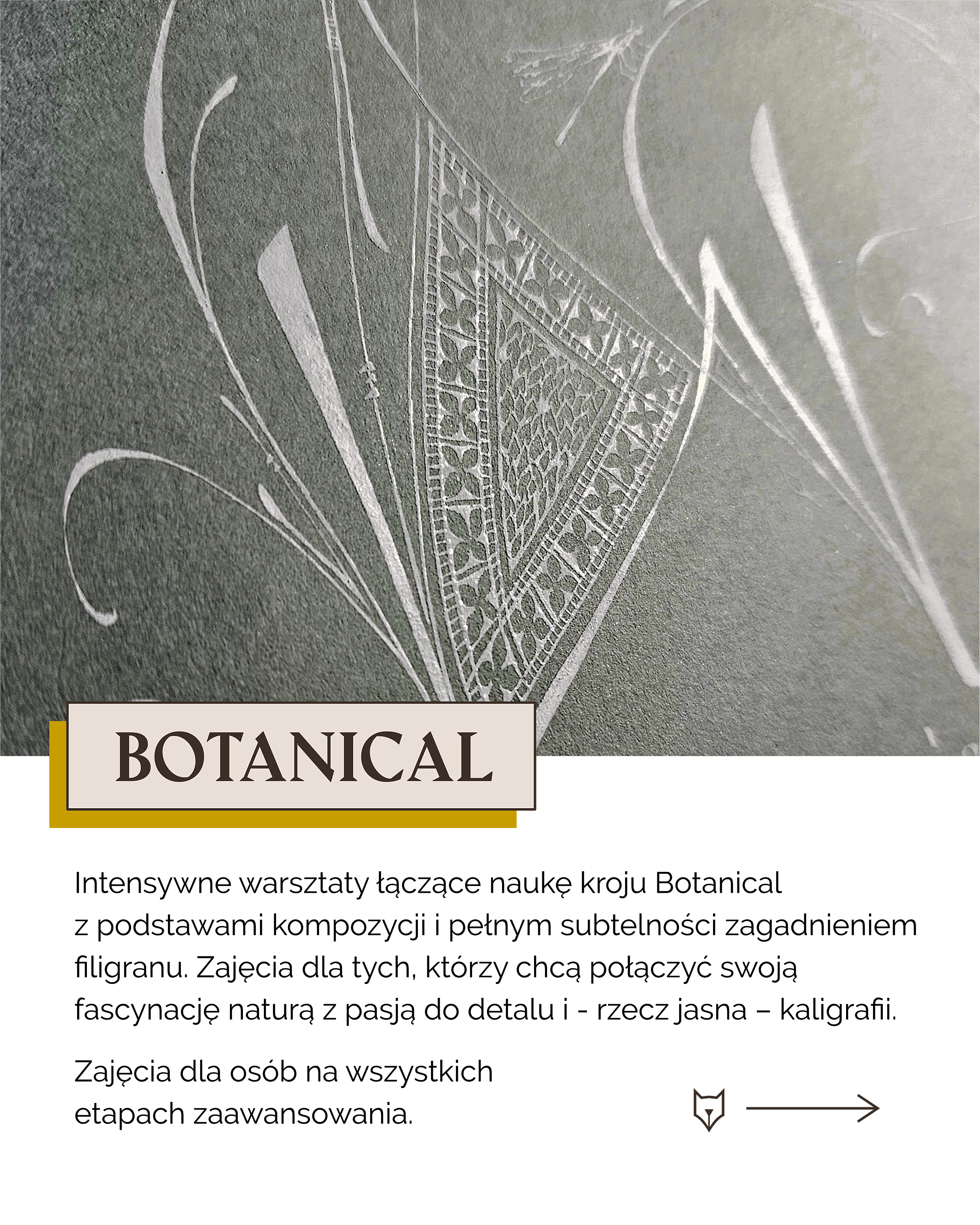 Intensywne warsztaty łączące naukę kroju Botanical z podstawami kompozycji i pełnym subtelności zagadnieniem filigranu. Zajęcia dla tych, którzy chcą połączyć swoją fascynację naturą z pasją do detalu i – rzecz jasna – kaligrafii.