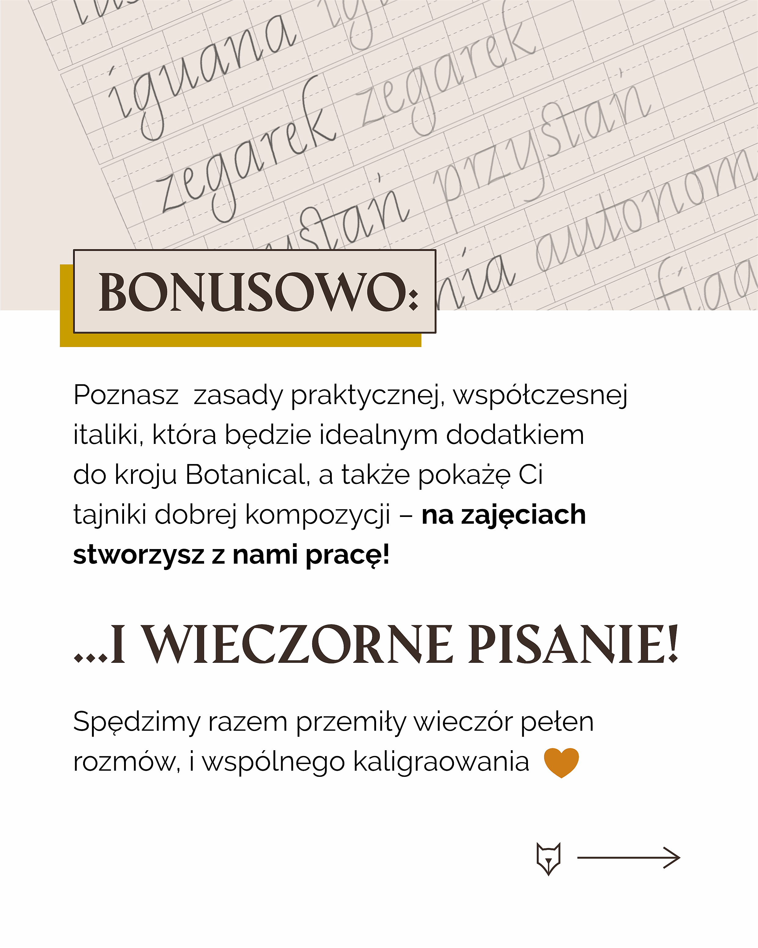 BONUSOWO ja (Wiola) wprowadzę Cię w zasady praktycznej, współczesnej italiki, która będzie idealnym dodatkiem do kroju Botanical, a także pokażę Ci tajniki dobrej kompozycji – na zajęciach stworzysz z nami pracę!