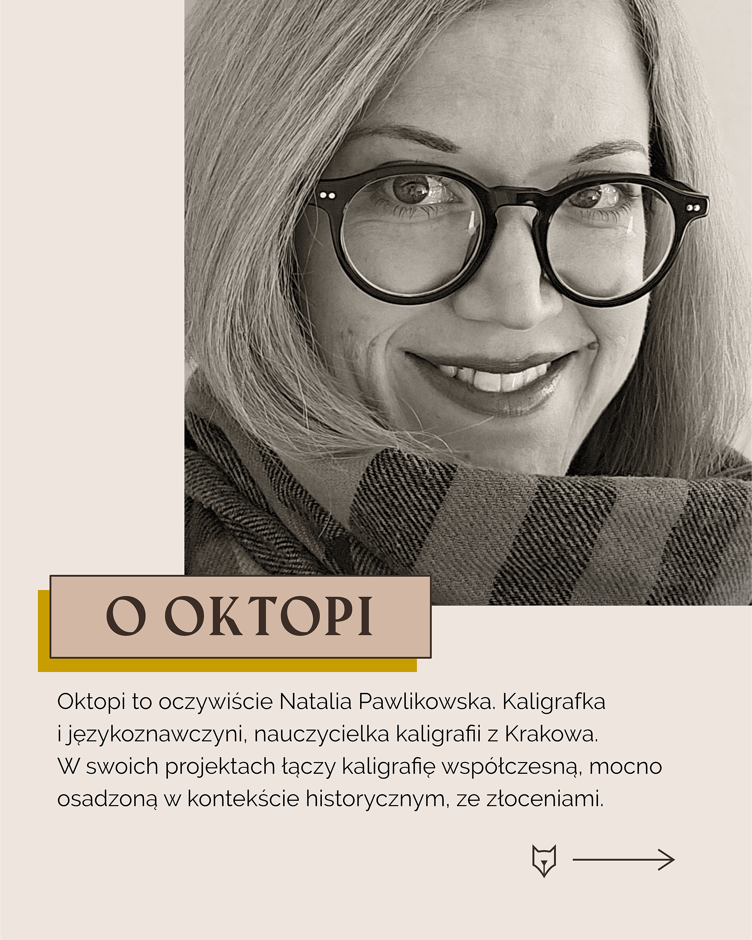 Oktopi to oczywiście Natalia Pawlikowska. Kaligrafka i językoznawczyni, nauczycielka kaligrafii z Krakowa. W swoich projektach łączy kaligrafię współczesną, mocno osadzoną w kontekście historycznym, ze złoceniami.