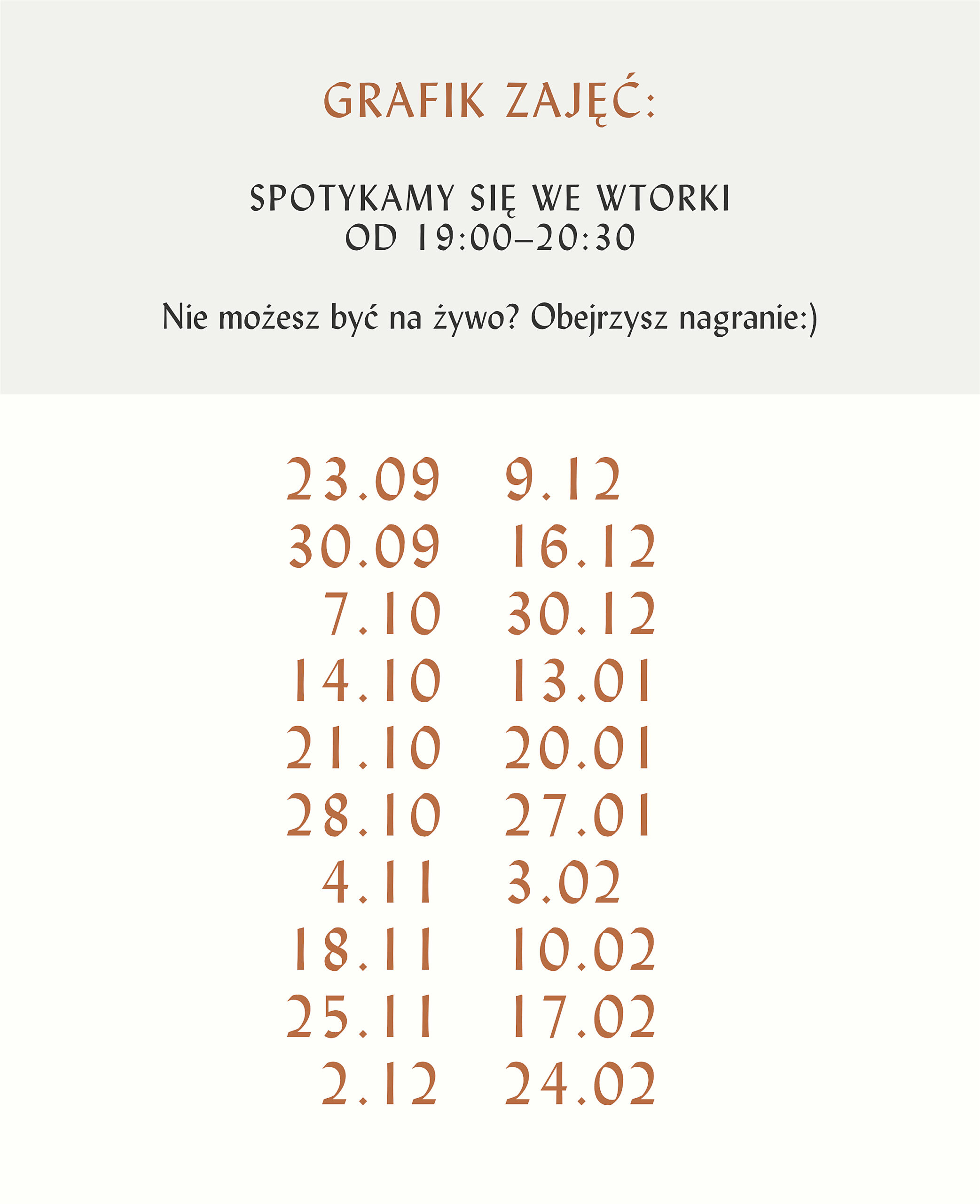 Spotkania BĘDĄ NAGRYWANE – to udogodnienie dla osób, które nie będą mogły uczestniczyć w lekcji na żywo. Nagrania będą również dostępne przez 4 tygodnie po zakończeniu kursu.